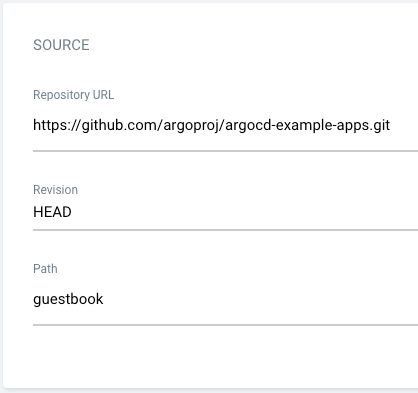 • Repository URL: Set to https://github.com/argoproj/argocd-example-apps.git